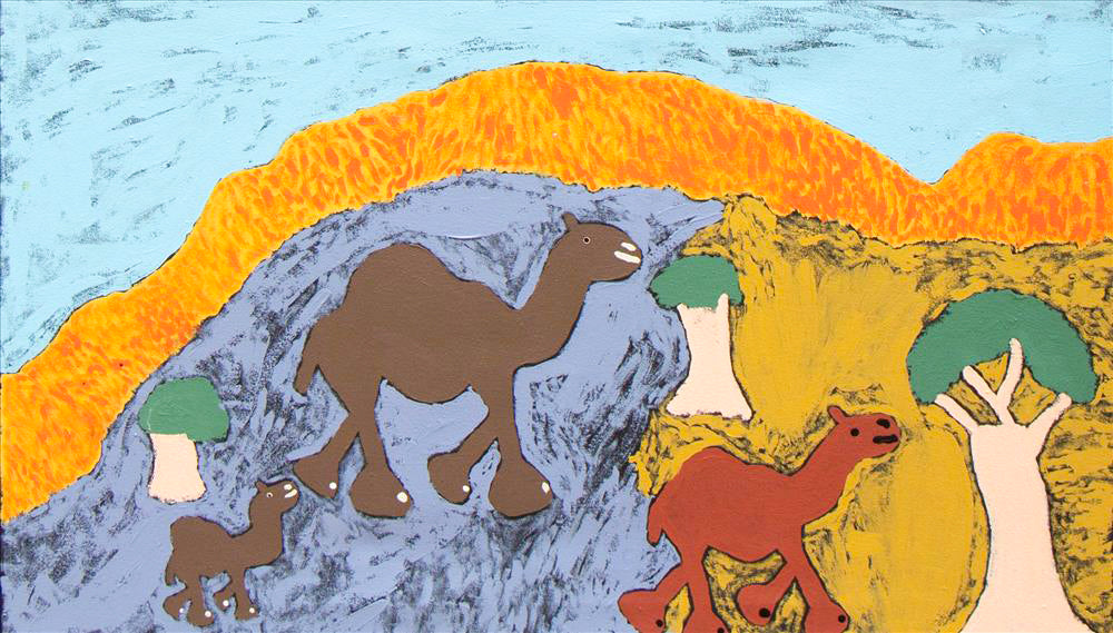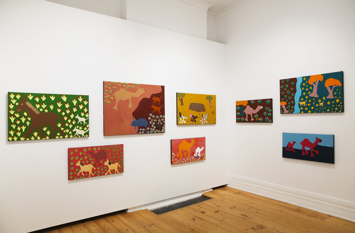 His abstracted landscapes, filled with depictions of animals that live in the Kaltukatjara region, ask the audience to suspend reality in order to dive into the joyous playfulness of his work.