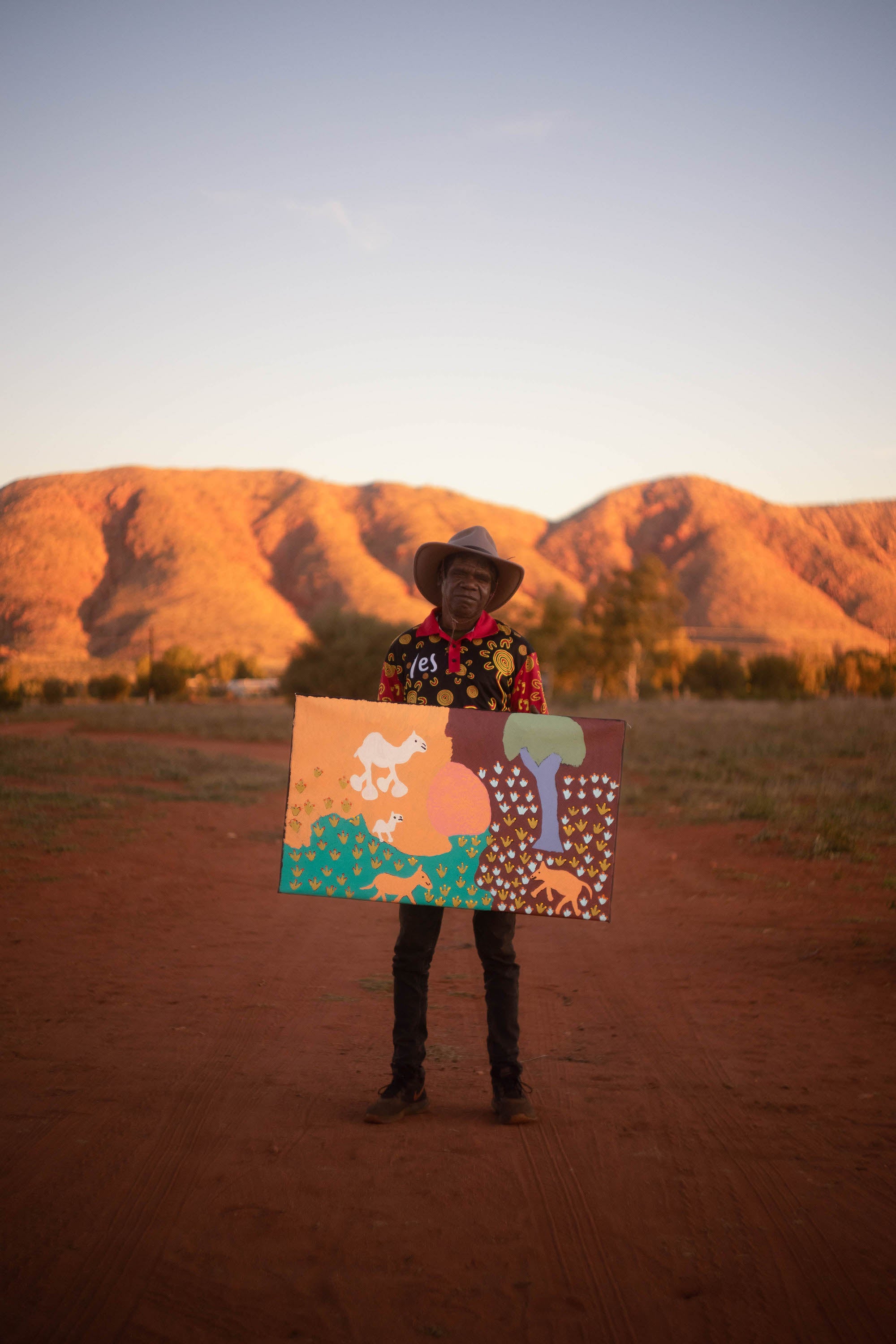Aaron communicates his knowledge of Ngura (country) by mapping out his family’s places. In his paintings he expresses his connection to these places through recognisable depictions of the flora, fauna and landscapes. Aaron’s knowledge of his Ngura - the Pitjantjatjara lands around Uluru and Kaltukatjara, NT - has been acquired over a lifetime of learning both through familial inheritance and lived experience. These diverse forms of knowledge are central to Aaron’s artistic practice, as is evident in his affectionate and joyful depictions of desert life.
