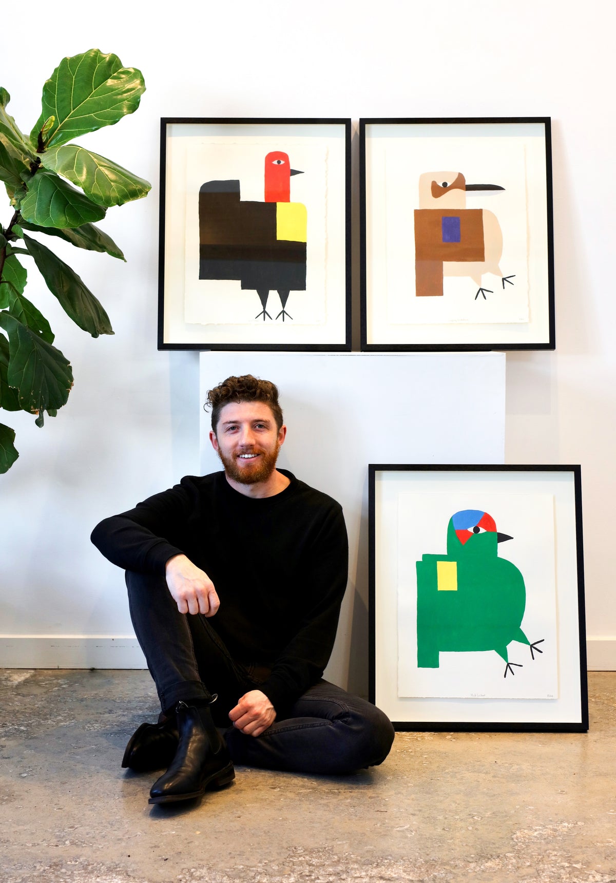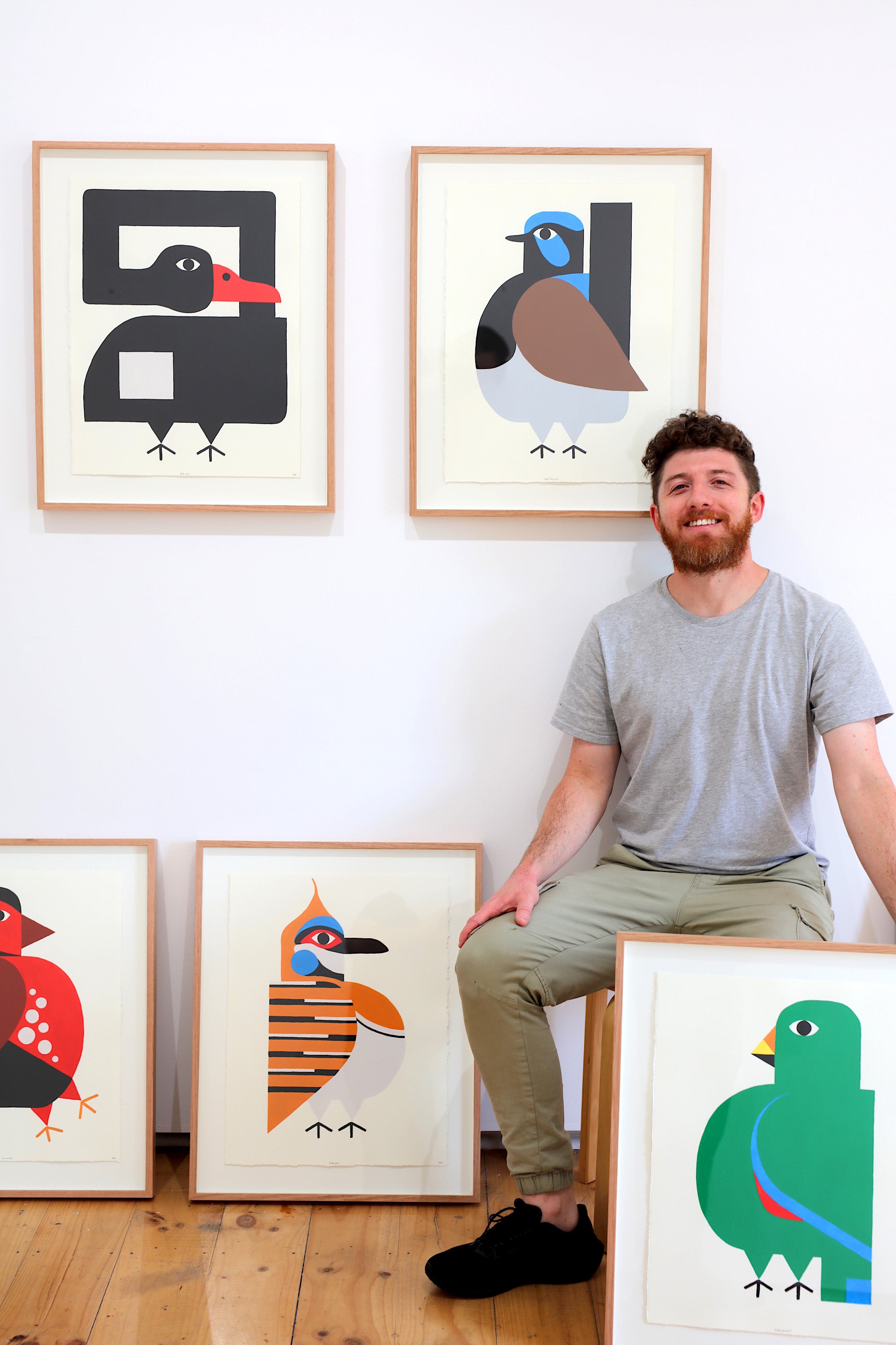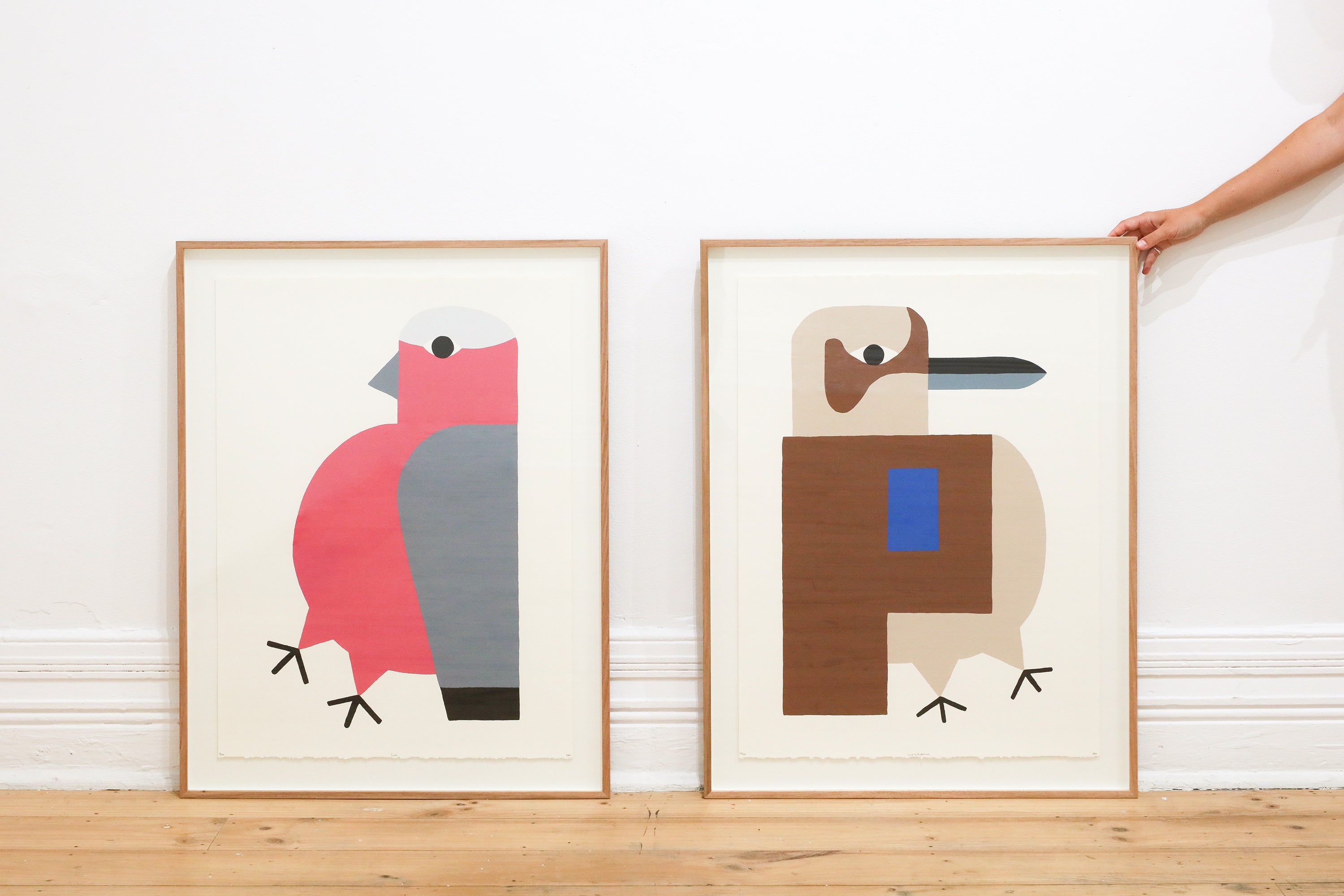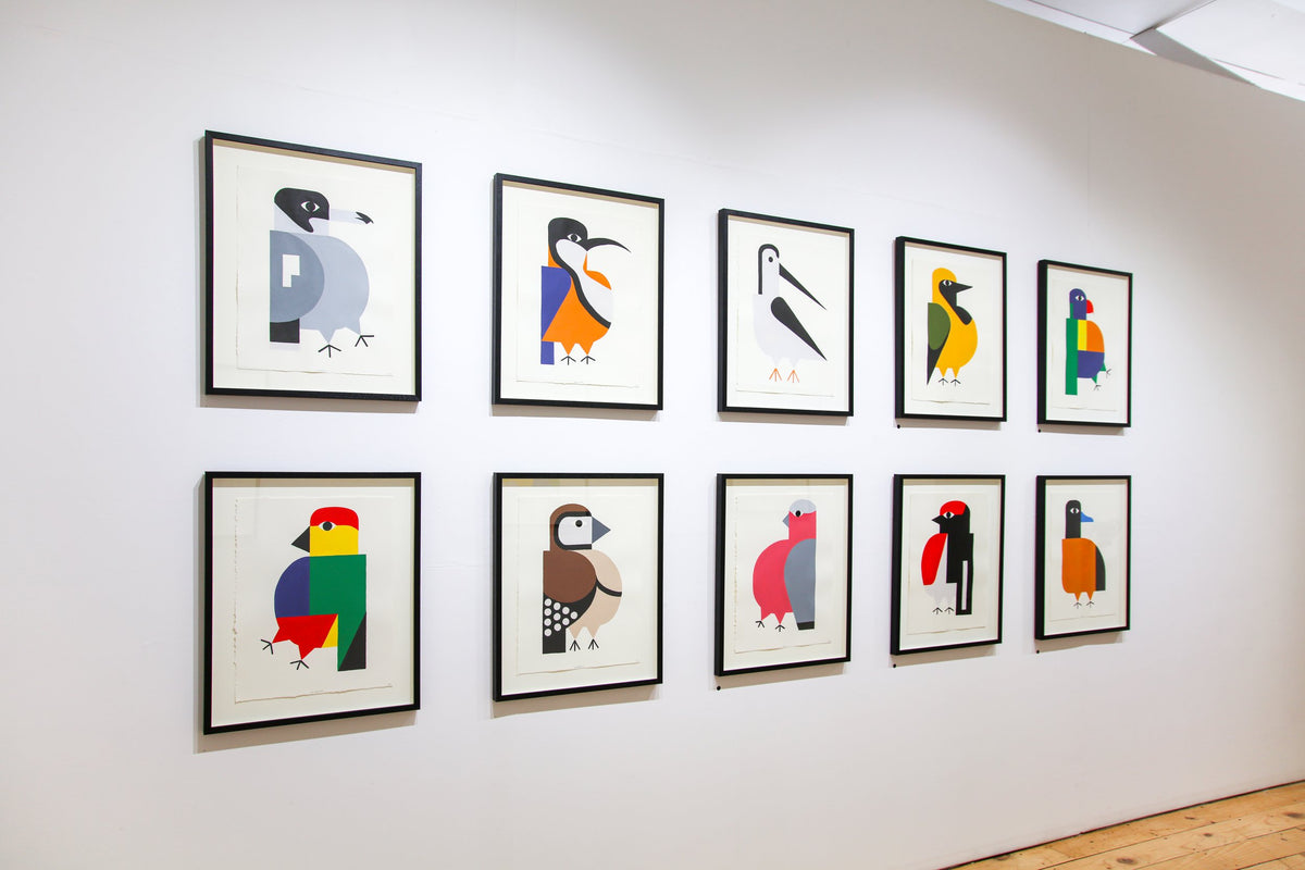A contemporary take on the scientific illustrations of pioneering zoologists John and Elizabeth Gould, Azzopardi pairs clean lines and minimal design with a reduced palette of block colours, producing playful portraits that boldly distinguishes each bird in the artist’s signature graphic style.
