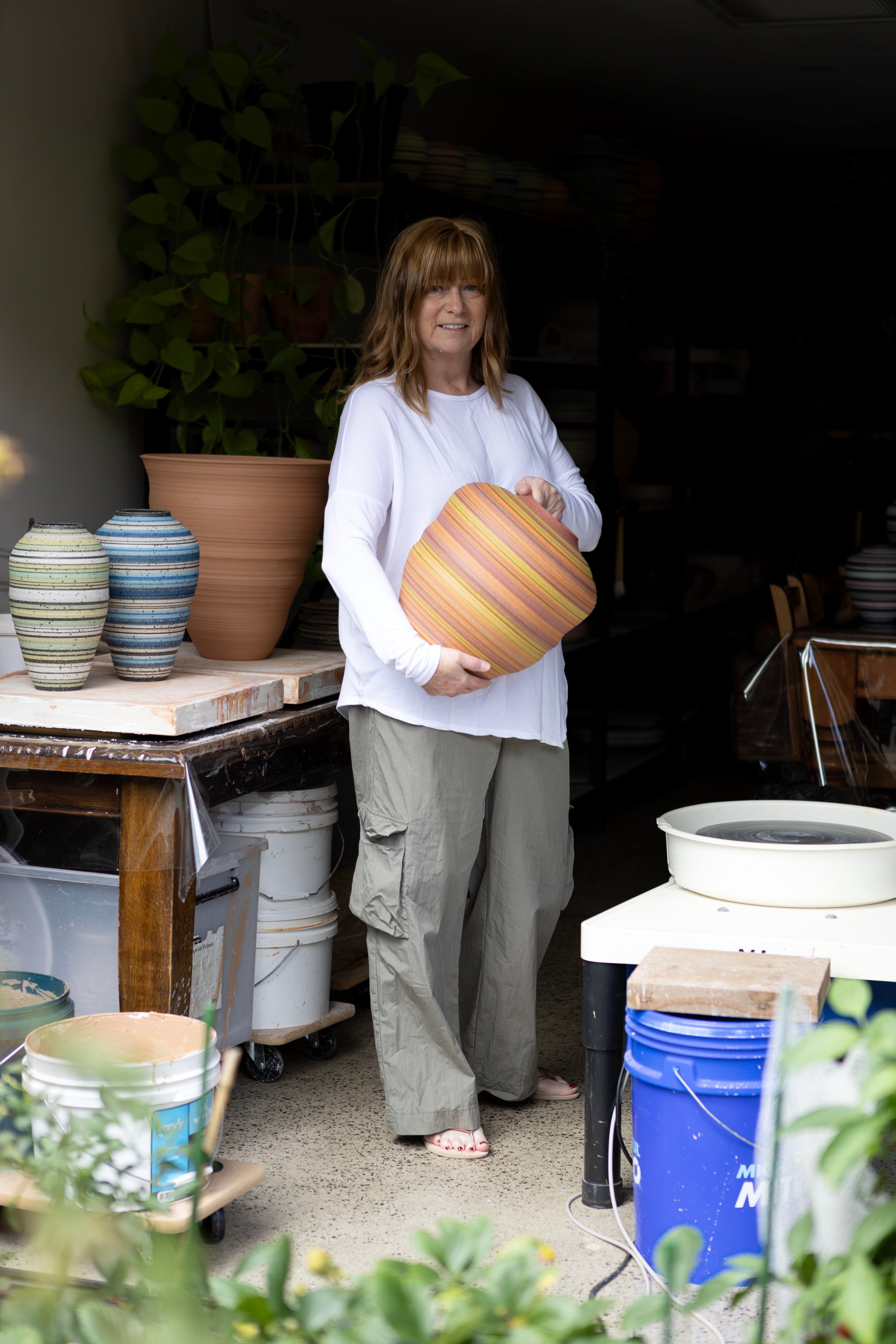 Gillian Martin, a ceramic artist based in Melbourne, creates textured clay vessels that explore pattern, rhythm and colour. Inspired by the dynamic dance between emotions and the environment, each colour presents its own story—warm tones radiate energy, cool tones offer serenity, and contrasting hues spark dynamic tension. Her thrown organic forms embrace stripes of geometric precision, directing attention to shape and surface intricacies. This technique adds depth, highlights, and shadows to the forms, enhancing their realism and creating a sense of volume.