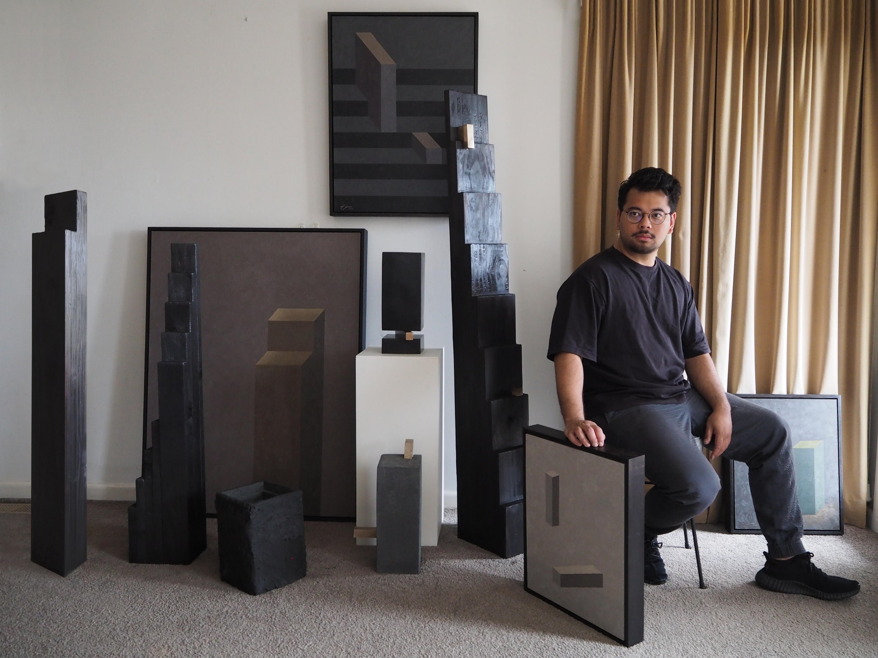 He explores this through sculpture, painting and installation, developing a symbiotic process between the two disciplines. Architectural tectonics are central to his sculptures and paintings, where the boundaries of art and architecture begin to blur. Gatip’s practice often employs simple geometries, colour, and composition, leaving an anthropomorphic imprint of himself on his paintings. Likewise, his sculptures rely heavily on materiality as a medium for storytelling.
