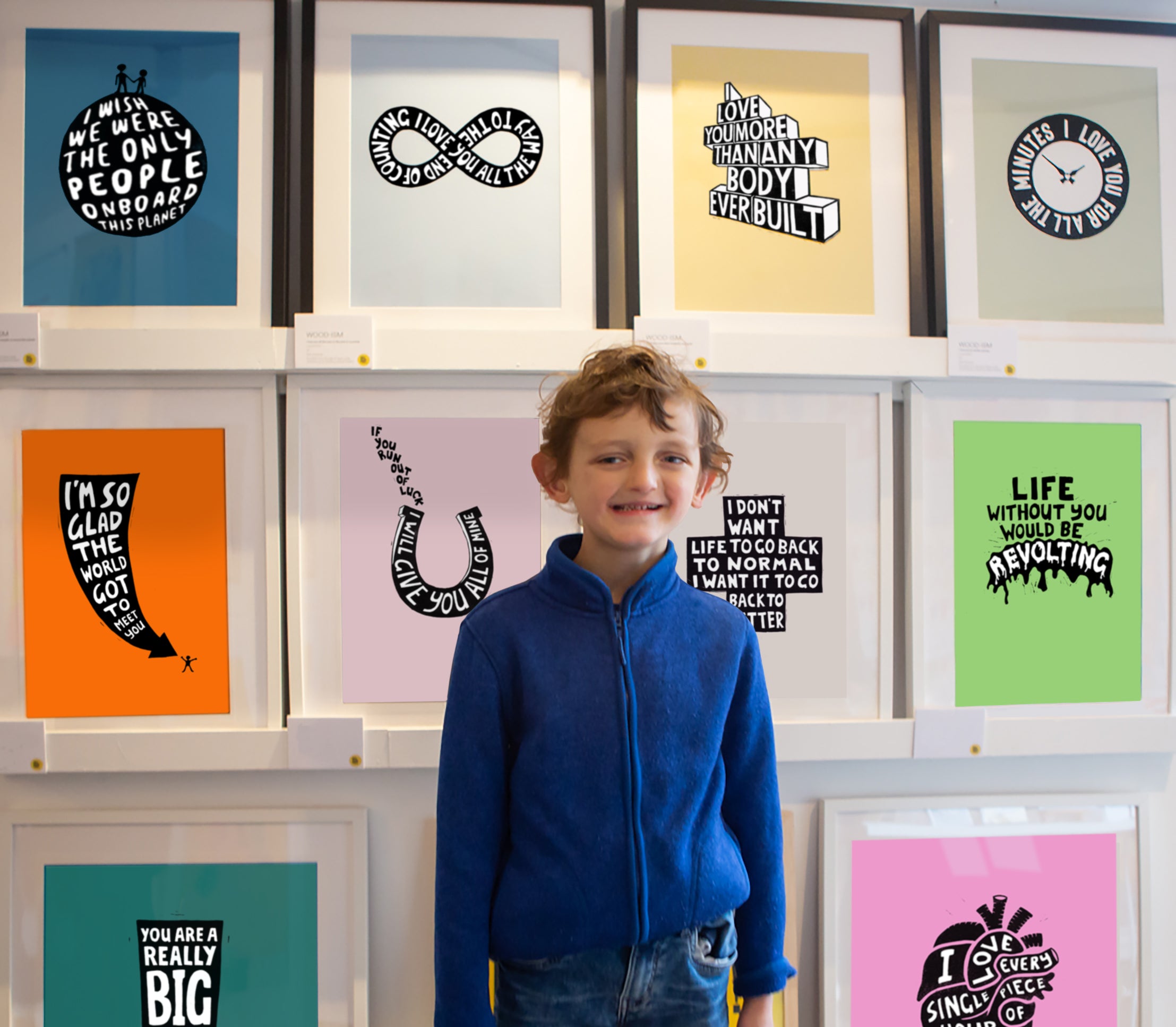 The collaborative creative process gave Woody and his dad a chance to connect as they worked on the designs. With a newfound confidence–as Woody sometimes struggled at school and found handwriting particularly challenging–suddenly his words became important. People wanted to hang them on their walls.