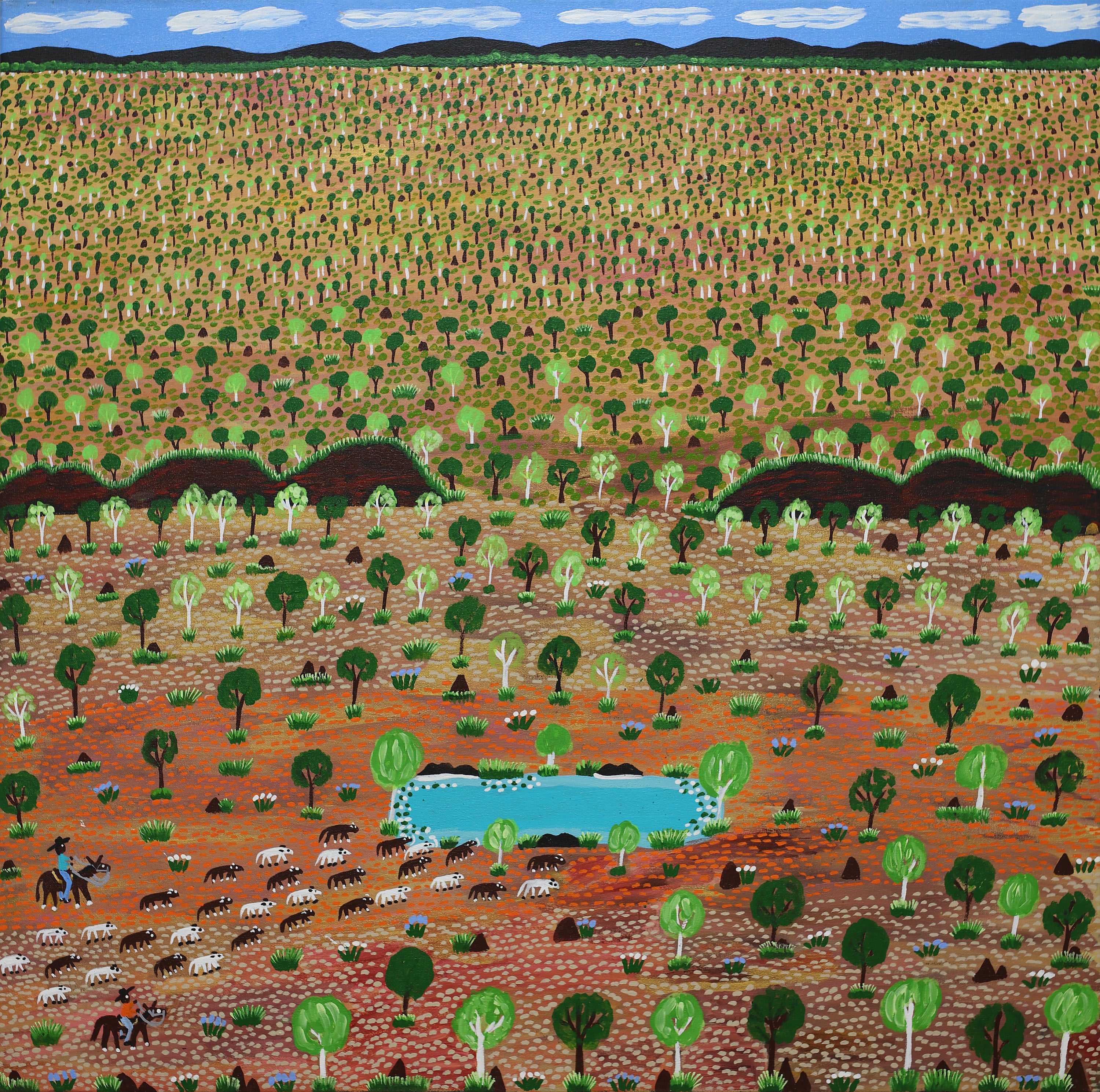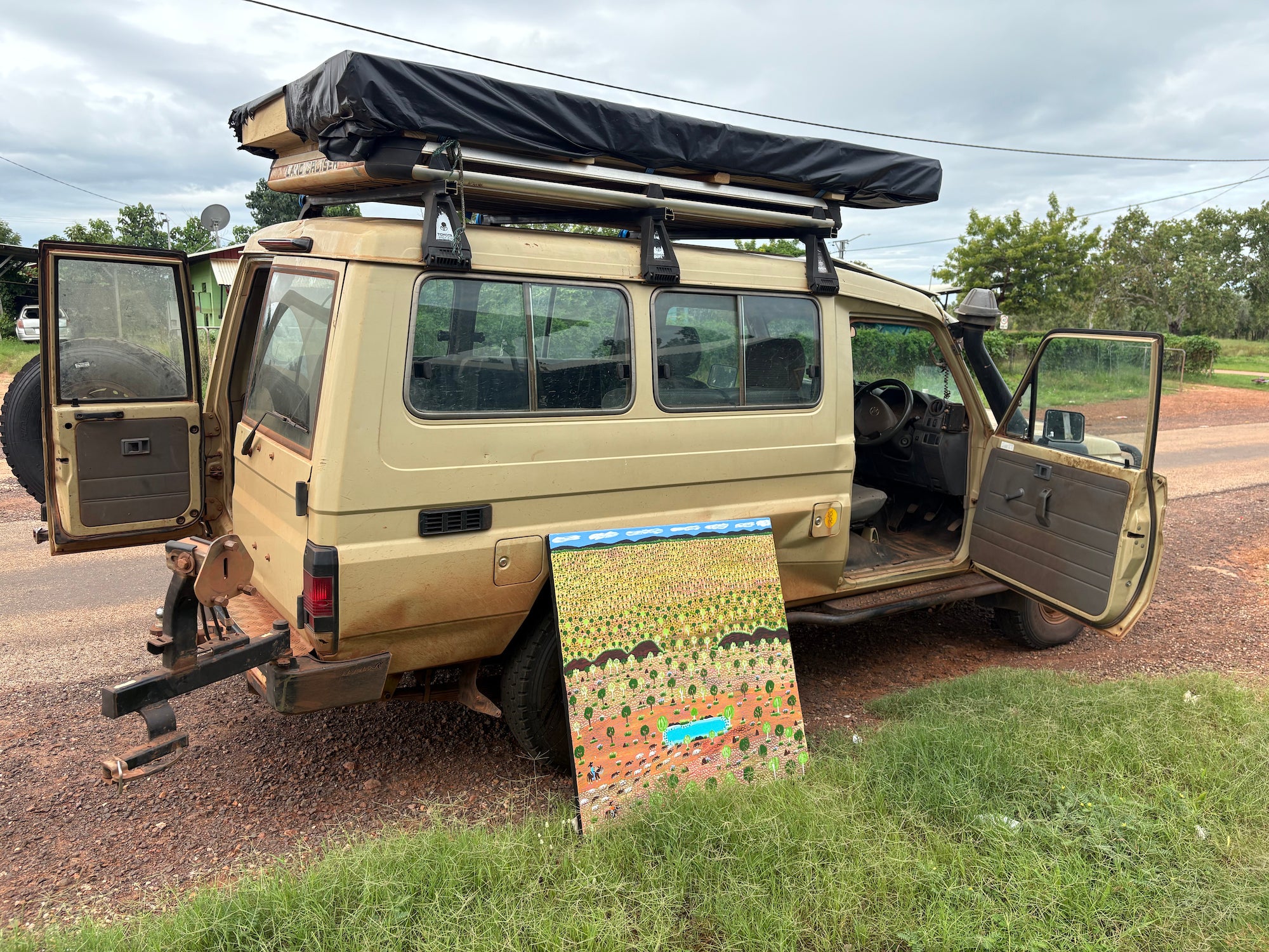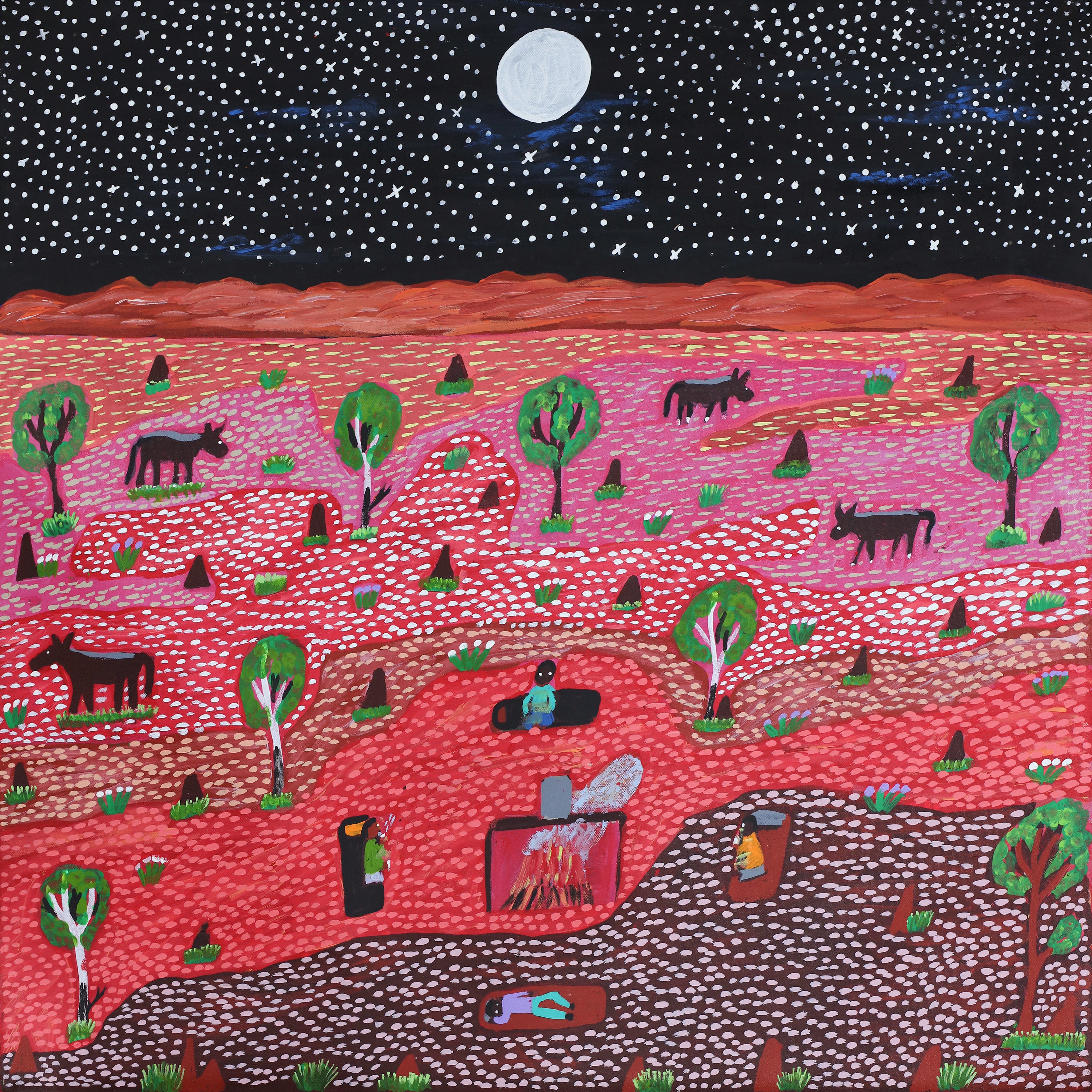 The building excitement is captured in Jill’s bold, expressive style, her palette shifting between the dry and wet seasons, day and night, encapsulating her distinctive and contemporary take on First Nations storytelling.