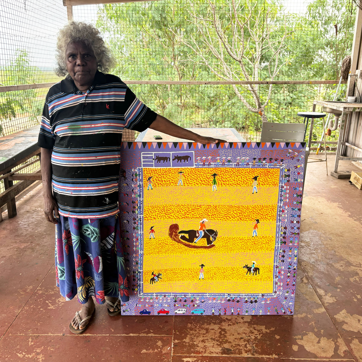 Back in the day we had Rodeo's here in Ngukurr. I used to look at how they were riding the cattle and horses, there in that yard. I grew up watching the rodeos when I was a young girl and I paint them now to remind myself of that time.”