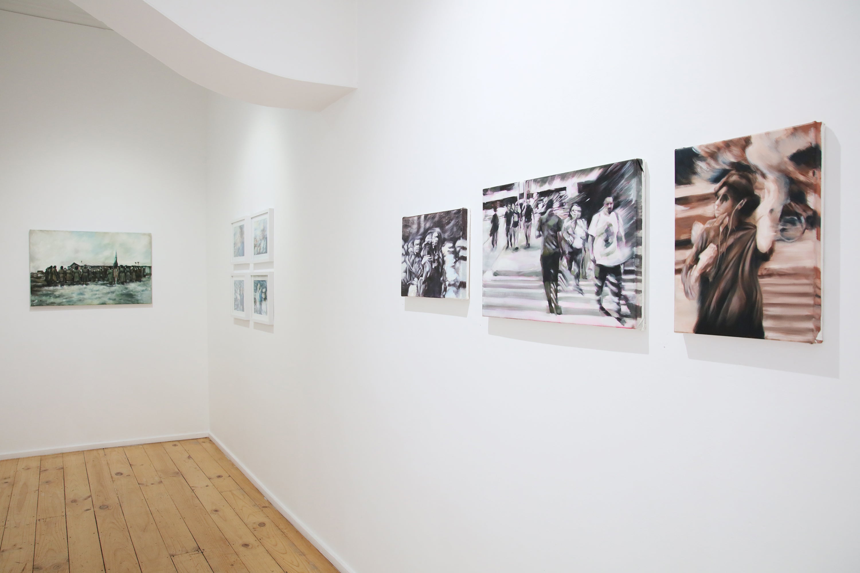 Through a combination of oil and mixed media, the artist juxtaposes these private recollections with contemporary depictions of faceless crowds, evoking both the intimacy of individual experience and the anonymity of collective movement. Layered compositions, dynamic textures, and contrasts between somber and luminous tones create a visual rhythm that moves between stillness and momentum, introspection and resistance.