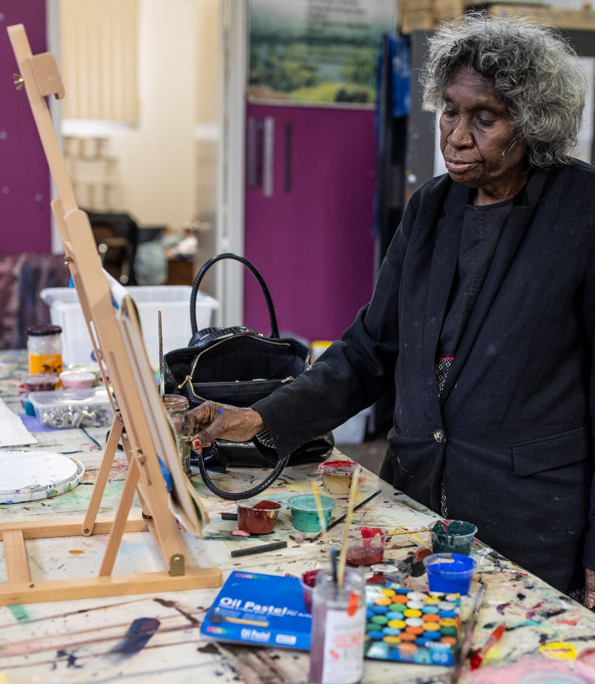 Image: Wendy Hubert in the Juluwarlu studio, courtesy of Juluwarlu Art Group.