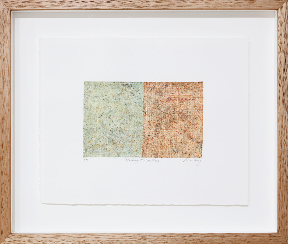 ‘What initially drew us to Fiona Davey’s work Weaving the Coastline was its re-interpretation of the traditional coastal landscape, coupled with the extraordinary intricacy of her technique. Within the work, fragments of archived coastline are captured, layered and interwoven, revealing a quiet mastery of printmaking at a minute scale. Though the image appears effortless and organic, it is in fact a carefully constructed, multi-plate etching. The woven surface of the immensely fragile, tissue-like paper evokes the gridlines of maps and aerial plotting, becoming a site upon which multiple landscapes are imprinted and fused into a new, composite terrain. The artist’s physical act of traversing the coastline across distant points is distilled into an area measuring less than 9×13cm, where time and space are compressed and the coastline’s textures are preserved as a delicate and enduring archive.'