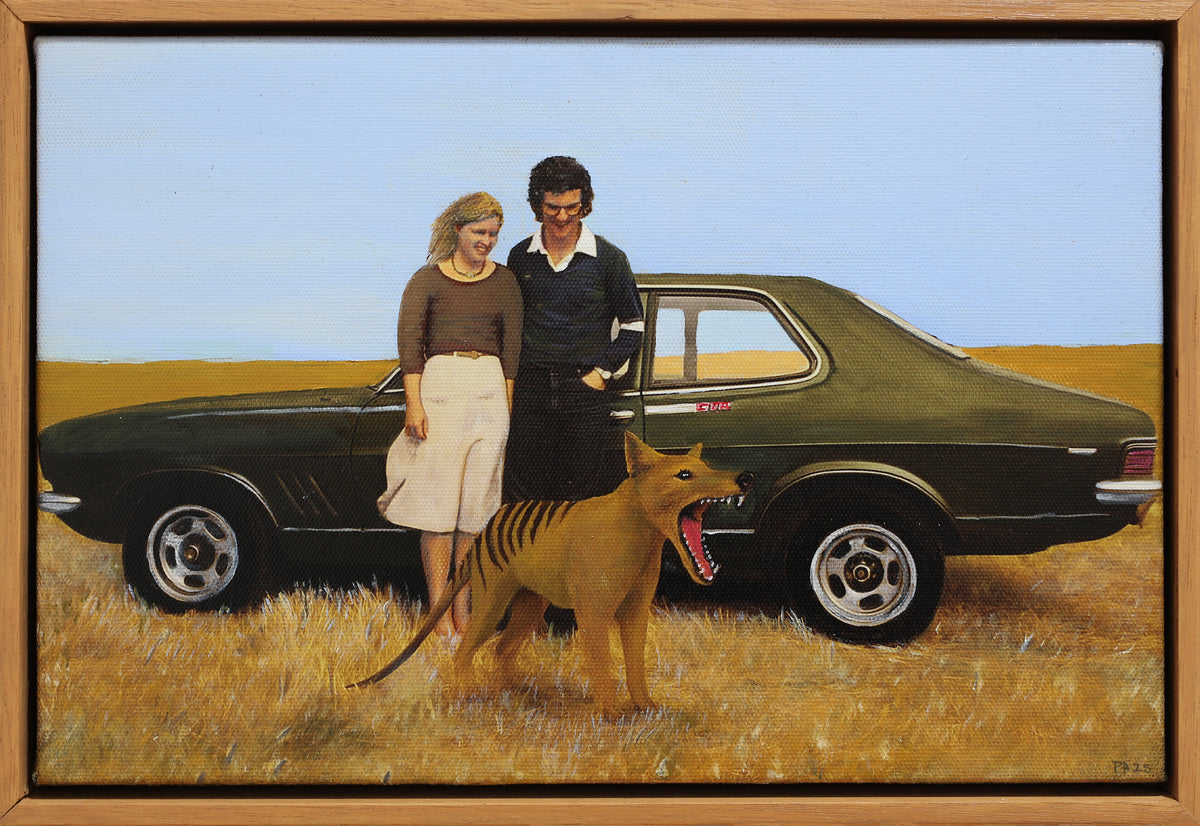‘In second place, Phil Hayes’ The Pet is an evocative painting that captivates the viewer at first glance. A male and female couple stand in 1970s clothing, in a scene which initially appears to be drawn from a family photograph. It is excellently painted in a hyper-real aesthetic, with the matte blue Australian sky and drought-scorched brown grass rendered in exceptional detail. We are immediately placed in time, with the 1973 LJ Holden Torana partially obscured by the couple, yet taking centre stage nonetheless. In the foreground, Hayes has seamlessly introduced a third figure, a Thylacine, known more colloquially as a Tasmanian Tiger.